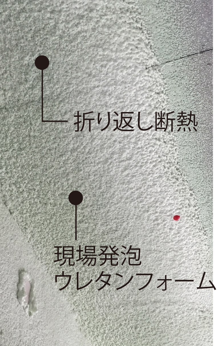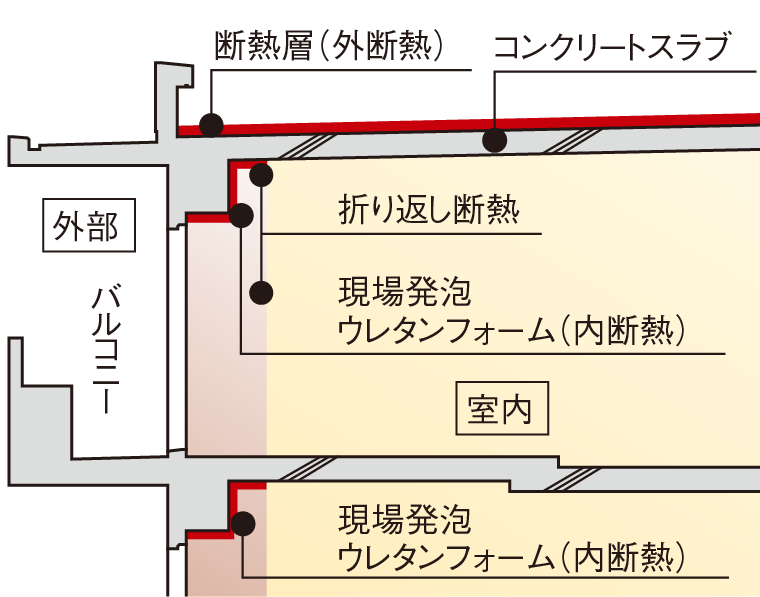 外部に面する壁・梁・柱の内側には、現場発泡ウレタンフォームによる内断熱工法を採用しています。また、直射日光が当たる屋上スラブには、コンクリートスラブの上に断熱層を設ける外断熱工法(一部除く)を採用し、直射日光などによる室内温度の上昇を緩和します。
