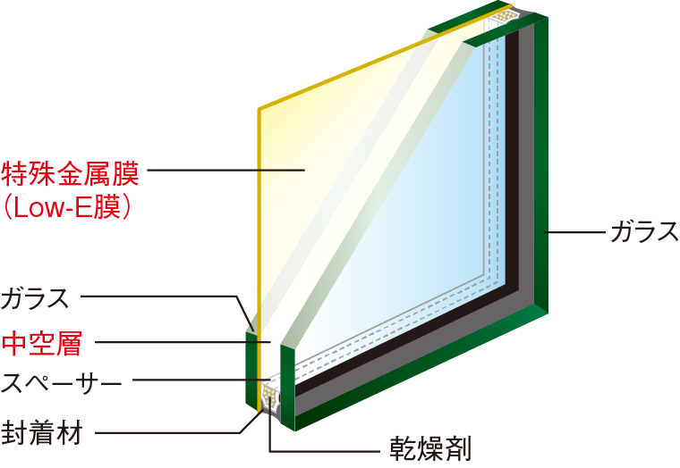 住戸の開口部には、ガラスの中空層側に特殊金属膜(Low-E膜)をコーティングした「Low-E複層ガラス」を採用しています。「特殊金属膜(Low-E膜)」により、複層ガラスの断熱性能(冬場の室温の保温)がより高まり、また一般の複層ガラスに比べて高い遮熱性能(夏場の太陽熱を軽減)が期待できます。 ※Low-E複層ガラスの使用場所及び仕様については係員にお尋ねください。