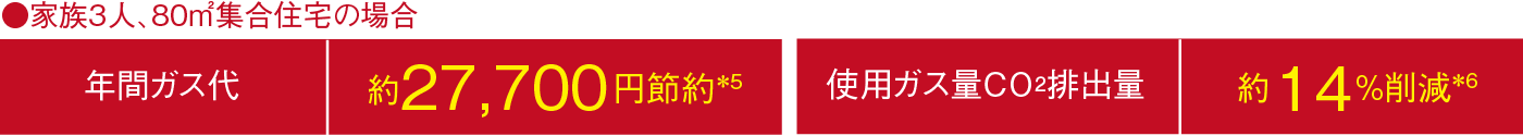 試算条件:*5*6家族3人、80㎡集合住宅の東京ガス試算例。従来型給湯器を使用し、家庭用ガス温水床暖房契約バス暖割(東京地区等)を適用した場合と、エコジョーズを使用し、家庭用ガス温水床暖房契約セット割(東京地区等)を適用した場合の比較。ガス使用量は季節に応じて変化するため、家庭用の平均的な月別使用量比率に従って年間ガス使用量を各月に割り付けたうえで試算(東京ガス)。居間の暖房はガス温水床暖房(セーブモードOFF)と電気エアコンを併用、居間以外の暖房及び冷房は電気エアコン使用、浴室暖房乾燥機使用(衣類乾燥週2回/年、浴室暖房週7回/冬期)。ガス料金は2022年9月実施の約款の料金表且つ2022年12月時点の原料費調整額を適用。料金表が変更になる可能性がありますので、詳細はお問い合わせください。機器の運転状況等により削減額・量は異なります。*6機器の運転状況により熱源機の熱効率は変動するため、熱効率を一定に固定したうえで試算。CO2排出係数はガス2.29kg-CO2/㎥(東京ガスデータ)。