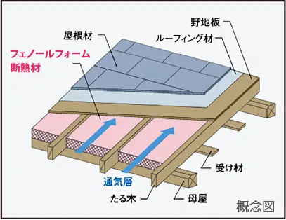 トップクラスの断熱性能。薄くても高いレベルの断熱性を長期にわたって発揮します。また、素材は強く燃えにくいフェノール樹脂。火に当たっても炭化し、燃焼時の発生ガスが少ないです。