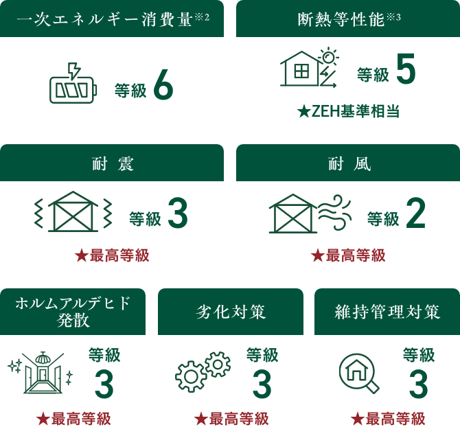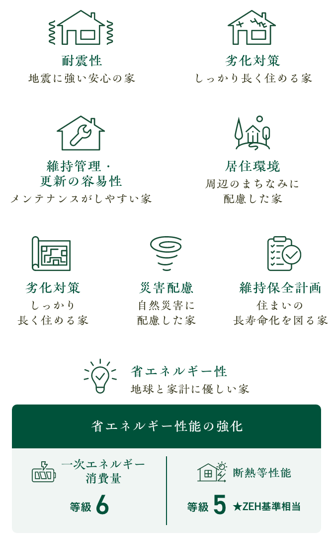 劣化対策や耐震等級などの5項目において最高等級(2025年12月時点)を獲得。 ZEH基準相当の高い品質を有していることが証明されています。