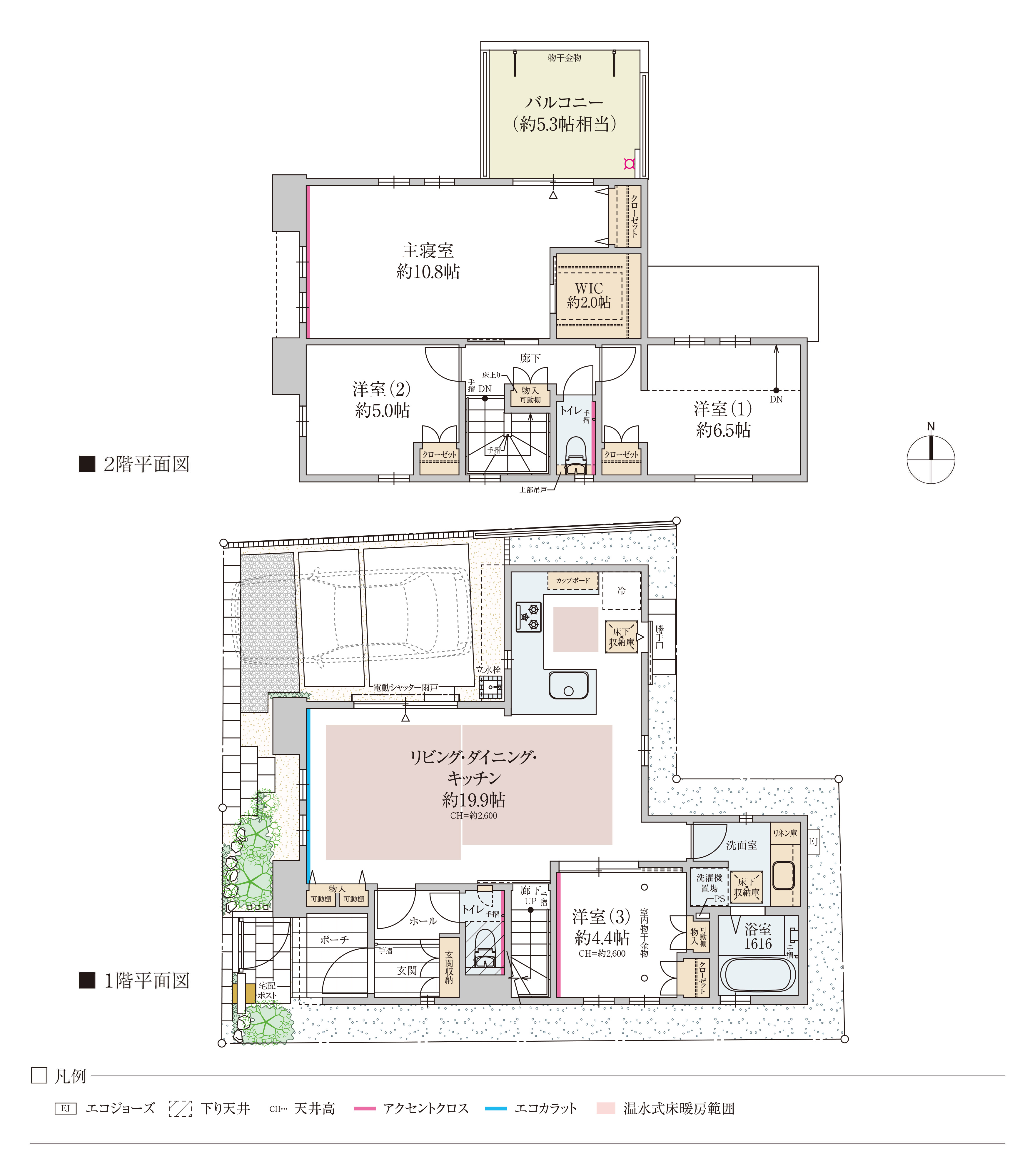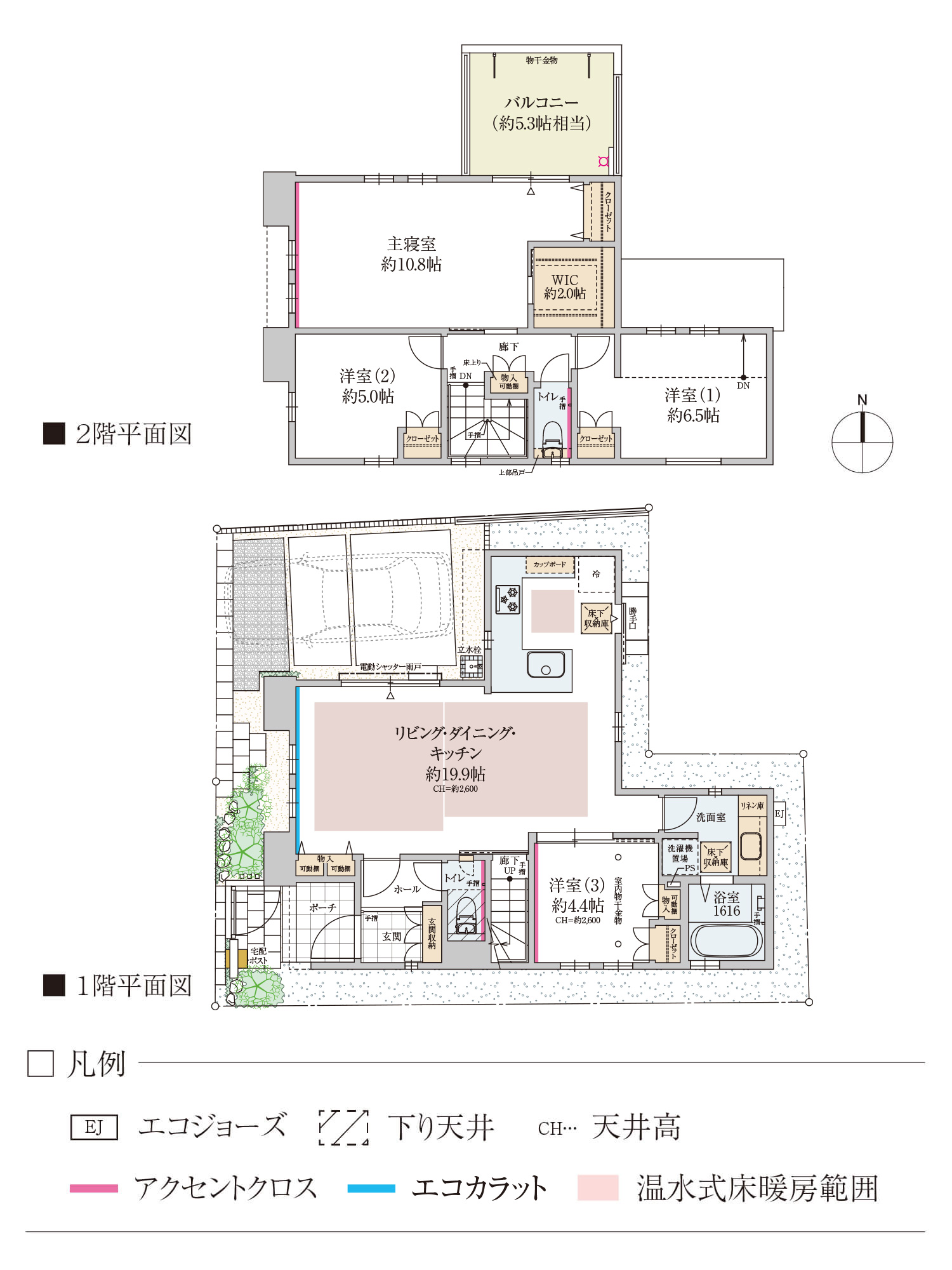 - 約10.8帖の広い主寝室にはウォークインクローゼットとクローゼットの2つを配置し、高い収納力を確保