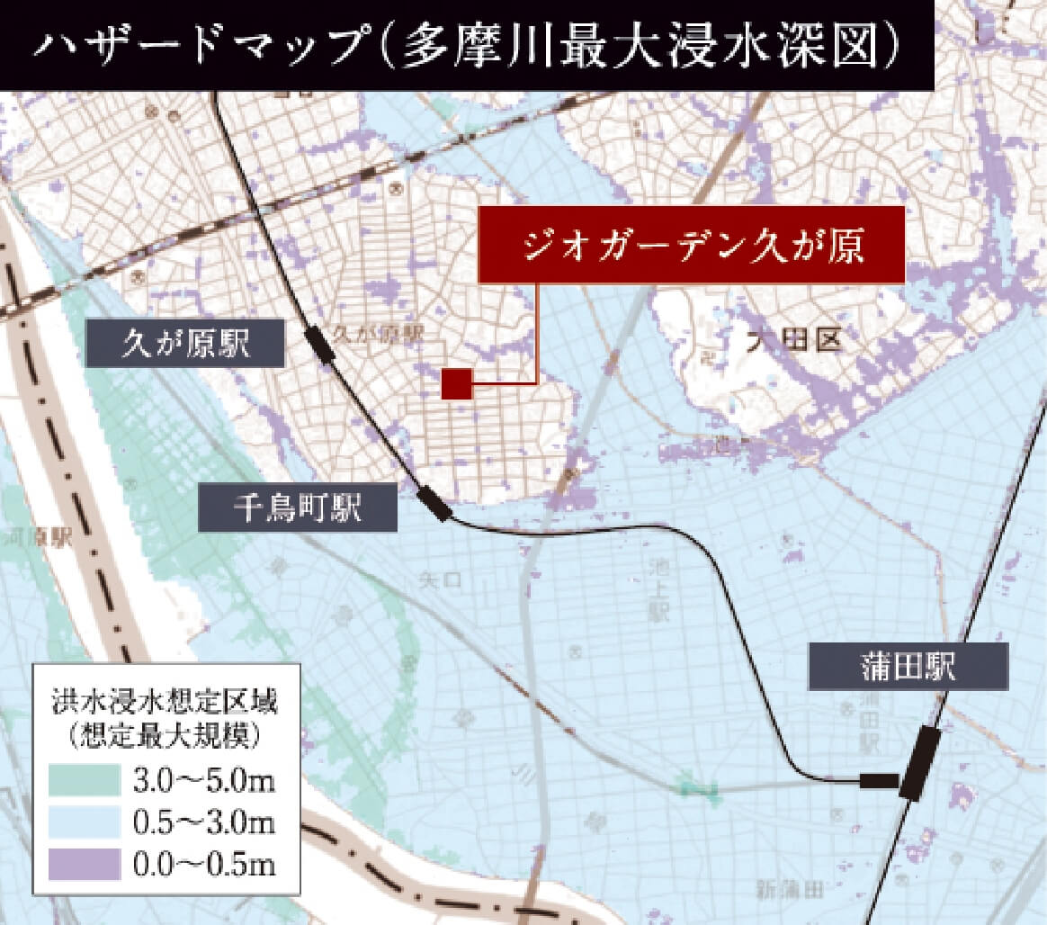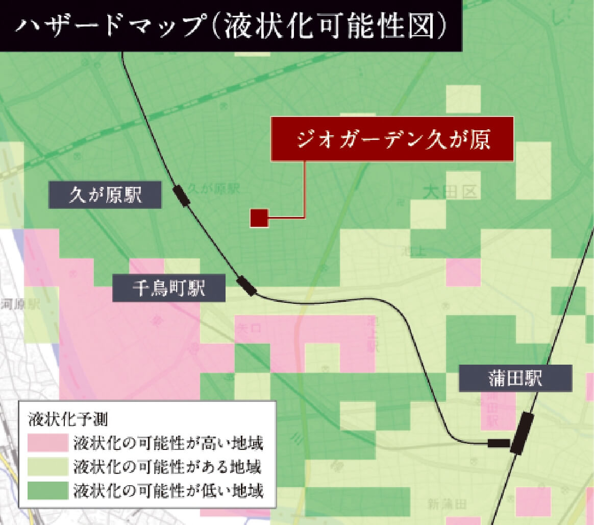 ※掲載のハザードマップ(多摩川最大浸水深図)およびハザードマップ(液状化可能性図)は、大田区防災ハザードマップをもとに作成したものです。地図は誤差を含んでいますので、概略位置を表示した参考図としてご覧ください。