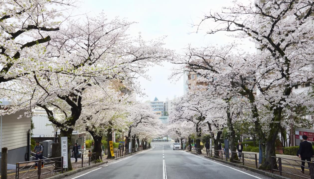 駅前に全長350m超の桜並木が続く