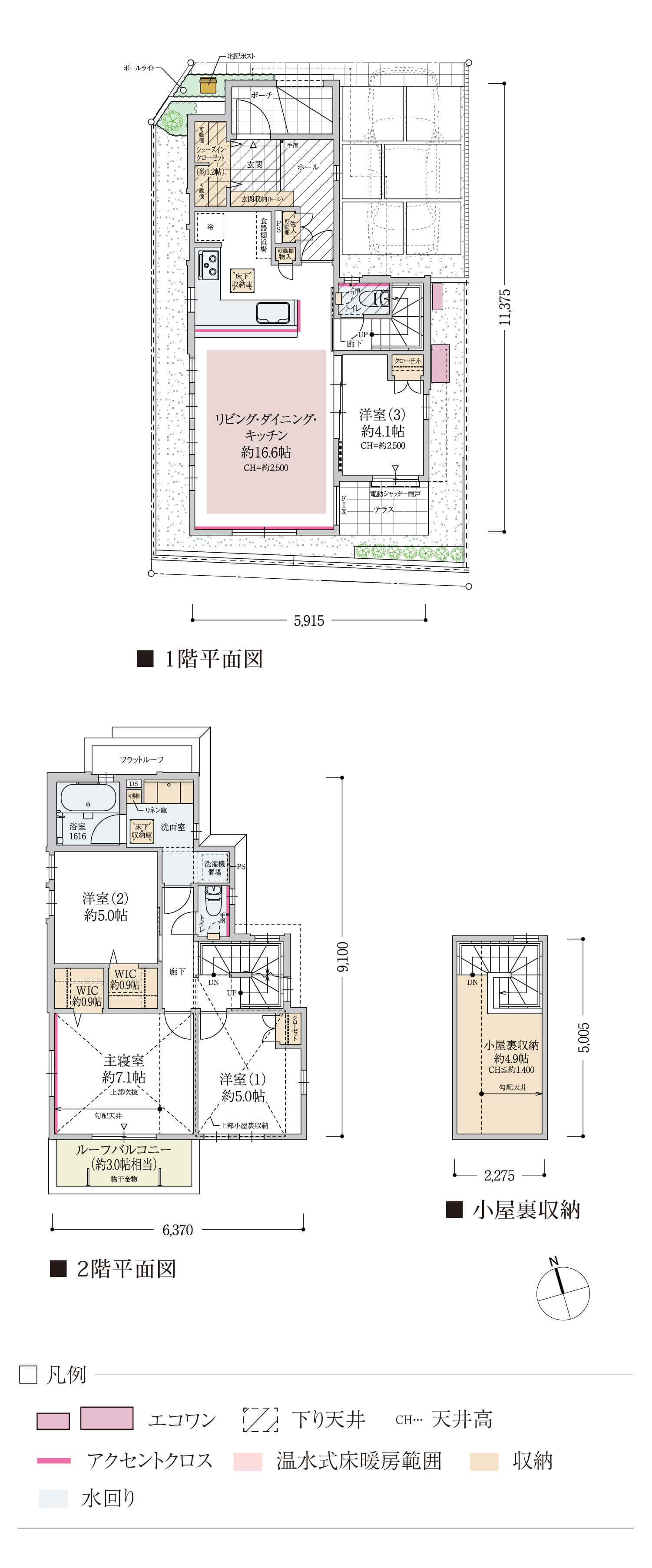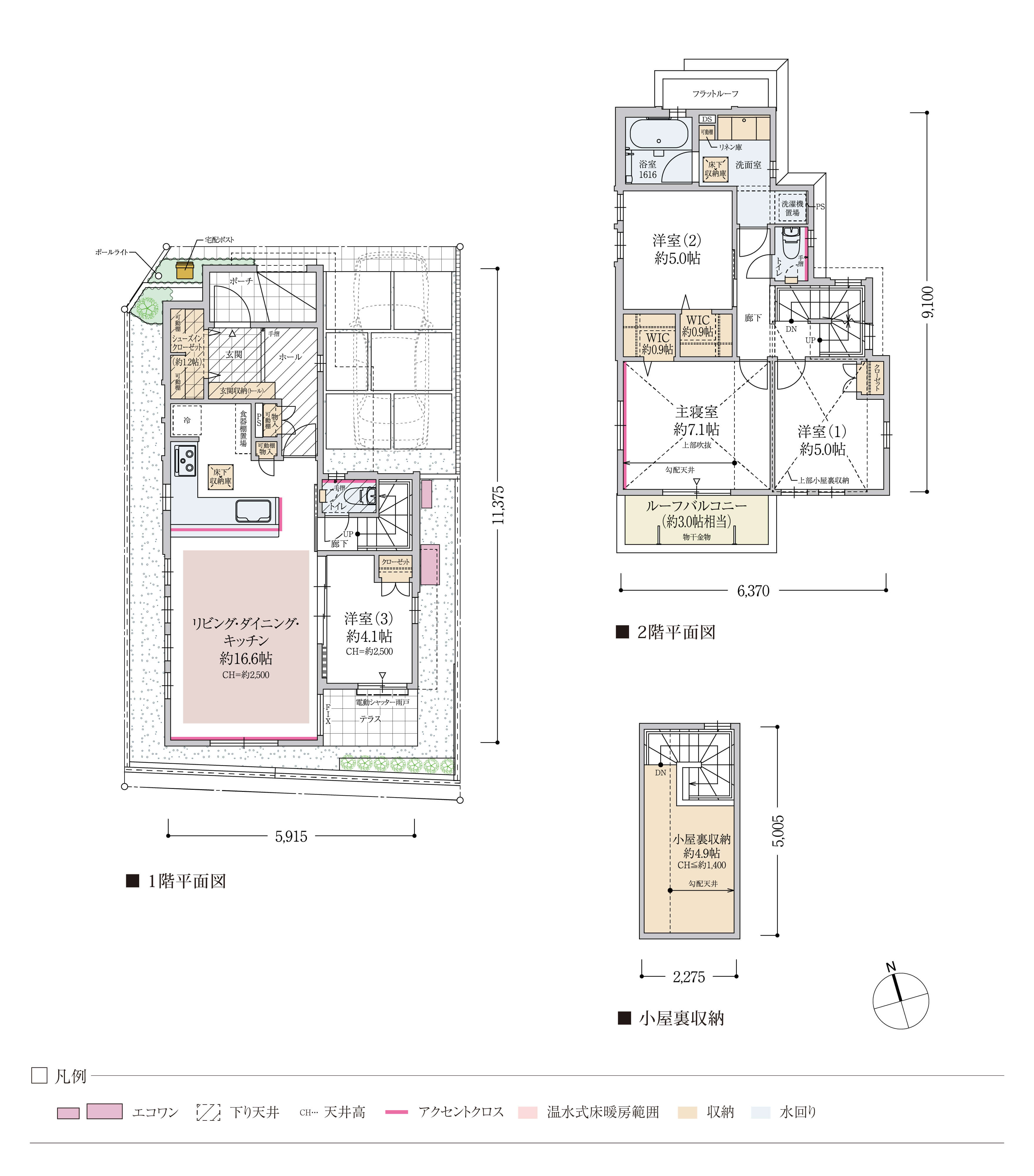 - 2つのウォークインクローゼットとシューズインクローゼット、レジャー用品等の収納に便利な小屋裏収納を設計