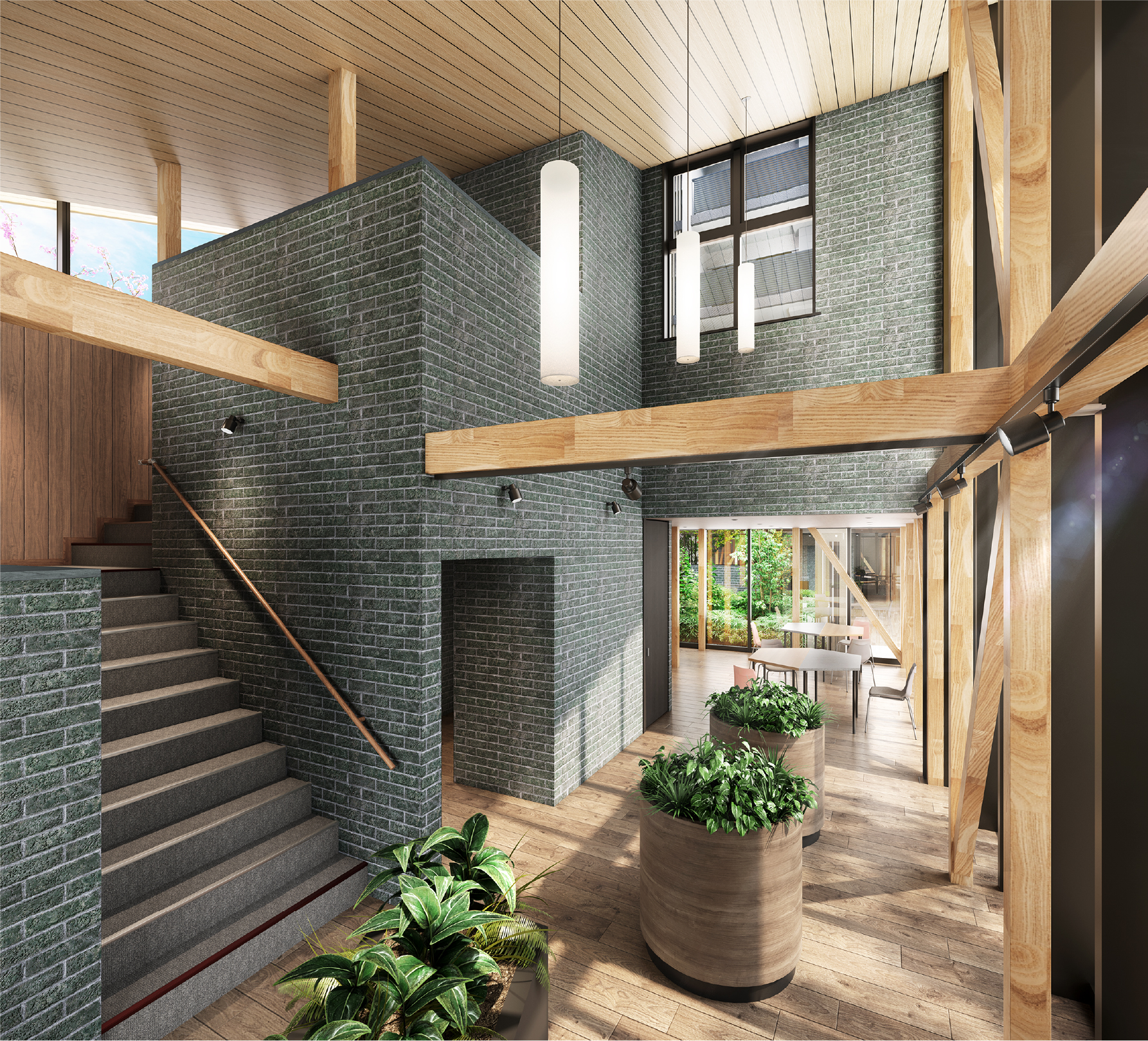 「フォレストロッジ」は外構の緑と中庭(アクティブコート)の緑のちょうど中間にある共用空間と位置づけ、木造にしました。木の温もりは自然体に還り、人と人をナチュラルにつなぐ力があると思います。視覚はもちろん、臭いや肌触りなどで木の温もりに包まれる癒やしのひと時を存分にお楽しみください。
