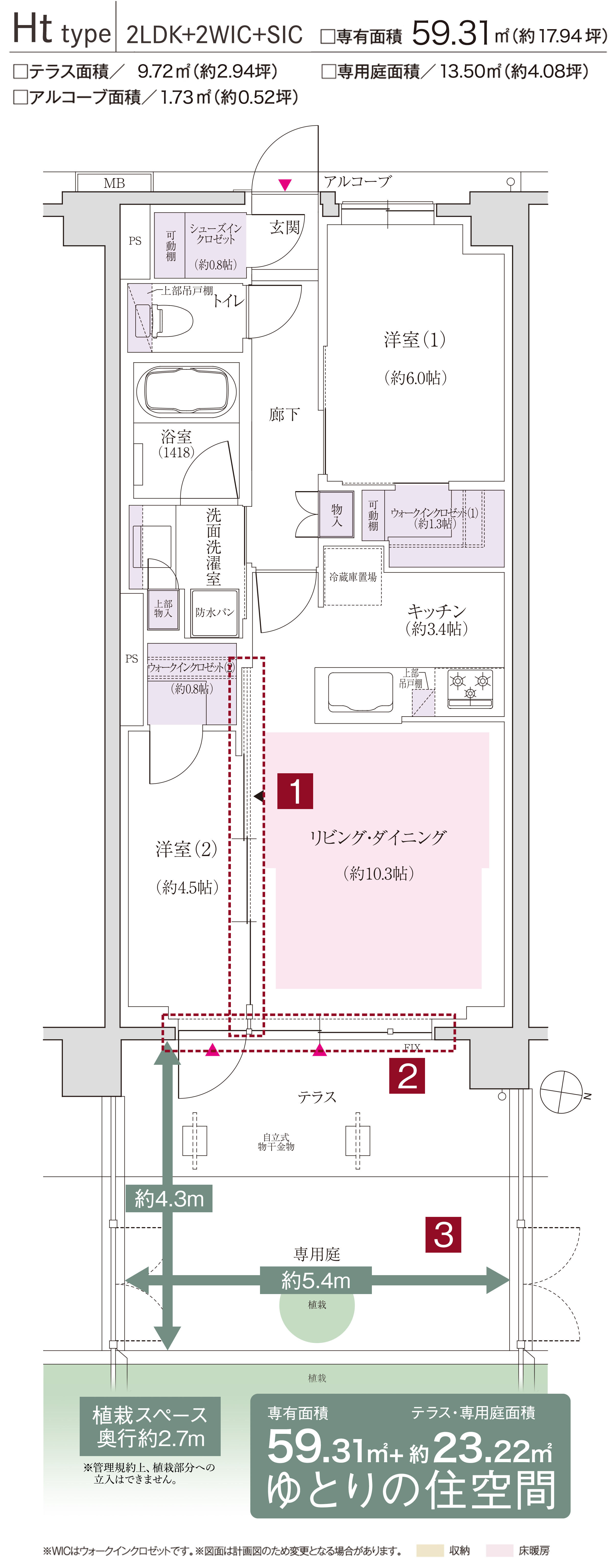 1階住戸のみリビング・ダイニングの天井高を約2.6mと高くしており、このリビング・ダイニングとつながるアウトドアスペースは、テラスが約1.8m、専用庭が約2.5mという奥行きを確保。さらに専用庭の奥にも、共用の植栽スペースを約3.0m確保しています(東向き住戸は約2.7m)。窓外の奥行きを広くすることで、空間的な広がりのあるリビング・ダイニングに陽光が十分に降り注ぎ、暮らしにいっそうの明るさと開放感をもたらします。