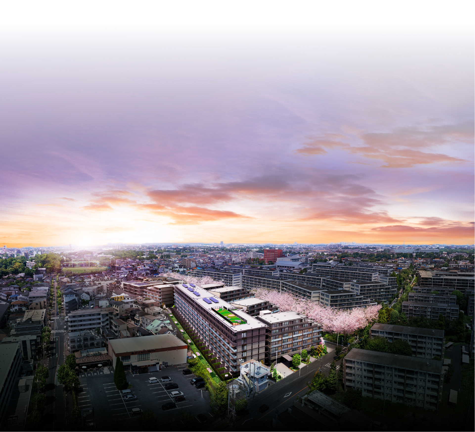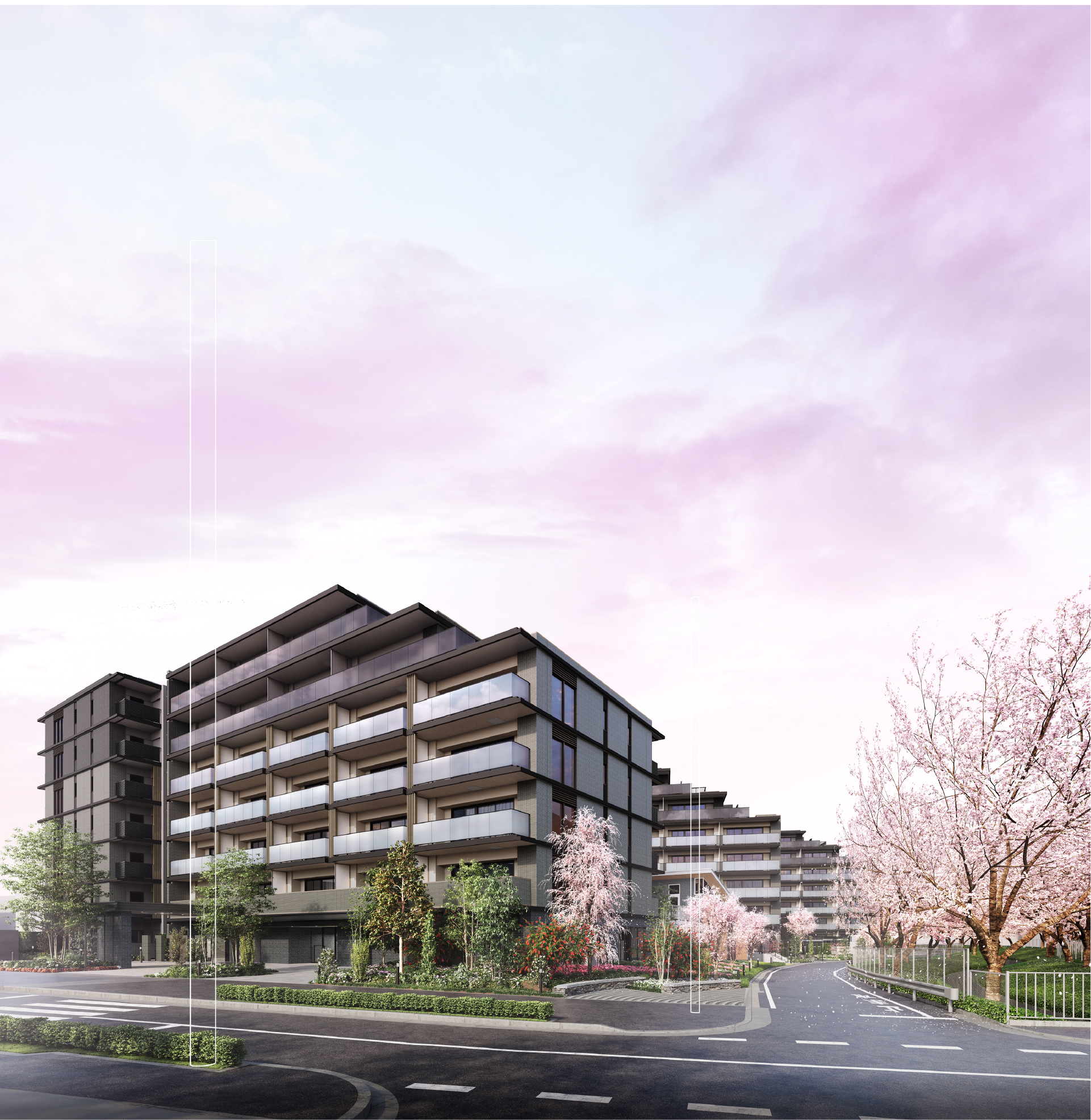 ※掲載の完成予想CG及び敷地配置イラストは、計画段階の図面を基に描き起こしたもので行政官庁の指導、設計上の都合により仕様・色彩・植栽等が変更になる場合がございます。周辺環境合成の外観完成予想CGは計画段階の図面を基に描き起こした外観完成予想CGと現地周辺から撮影(2025年7月/高さ約50m)した写真を合成加工したもので実際とは異なります。なお外観形状の細部、設備機器等は表現しておりません。現地周辺の電柱、標識及び敷地外の建物その他は一部再現しておりません。タイルや各種部材につきましては、実物と質感・色等の見え方が異なる場合があります。また、四季の植栽計画を同時に表現したものであり、特定の季節の開花状況を示すものではありません。植栽は予定種に近い画像を用いており竣工時の植栽は完成予想CG程度には成長しておりません。