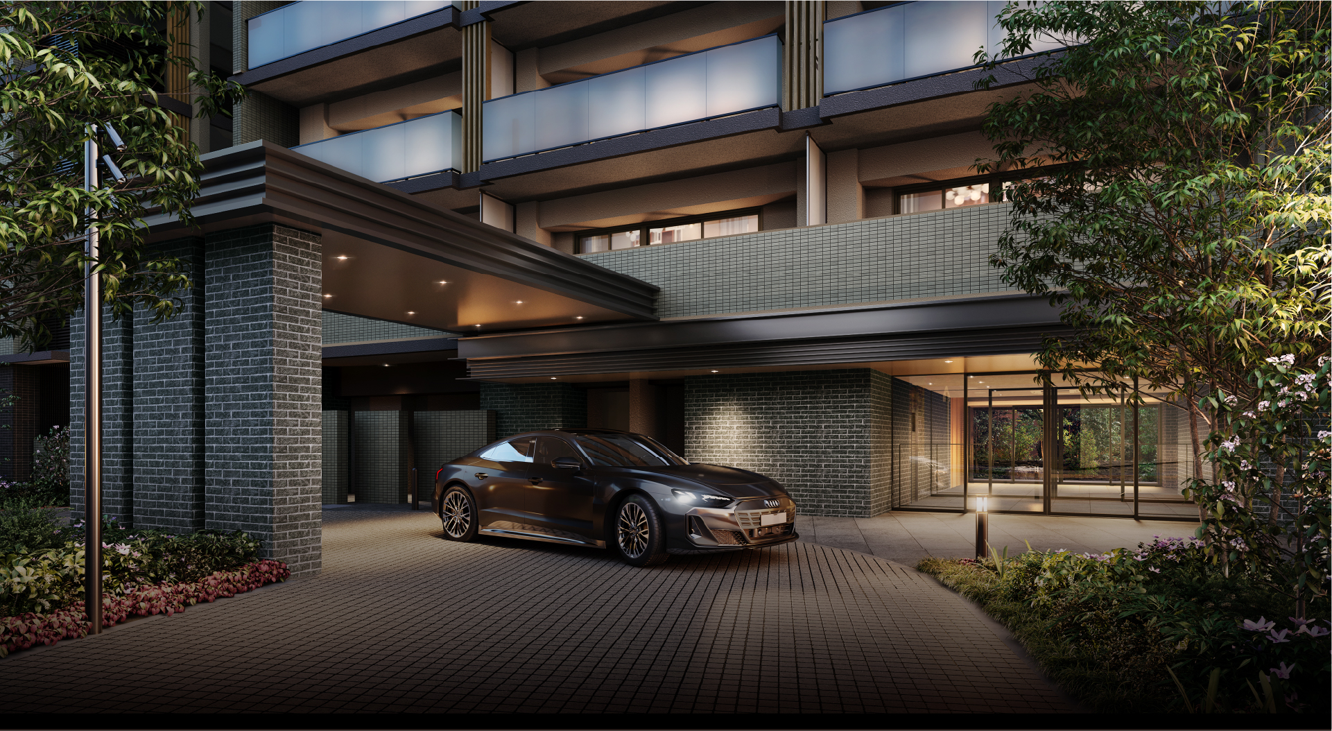 メインエントランスには車寄せをデザイン。半円状のダイナミックなアプローチ、大庇を備えた車寄せは、大規模レジデンスらしいゆとりと懐の深さを創出します。