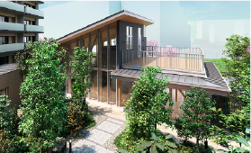 武蔵野の自然の温もりを五感で体感いただけるよう「木造」としました。2層吹抜の室内は親子や居住者同士で楽しめる共用空間に。2階テラスは屋外で仙川のお花見もお楽しみいただける予定です。