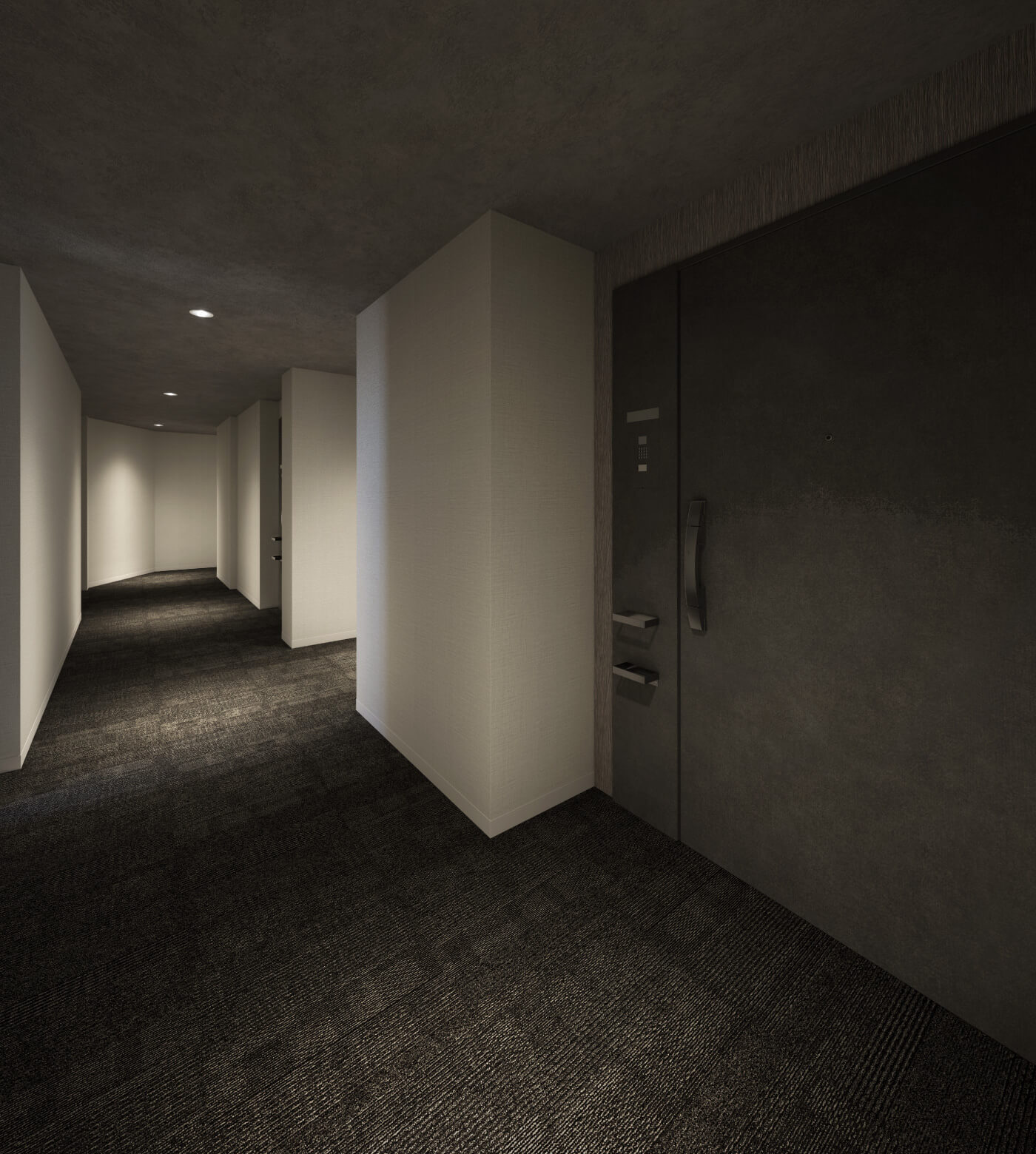 静寂な住まいへの切り替えの空間となるエントランスには、人々の安らぎにつながる自然素材を採用。最も目につく壁面には、木材のチップを原料とした「Mokkun」を塗装材として使用し、木の温もりを感じながら塗り物の柔らかさをエントランスに取り入れます。同時に、同じ壁面に「ジンバブエ(御影石)」を取り入れることで、住まいとしての温かみの中に、重厚な格式を併せ持つデザイン壁としました。