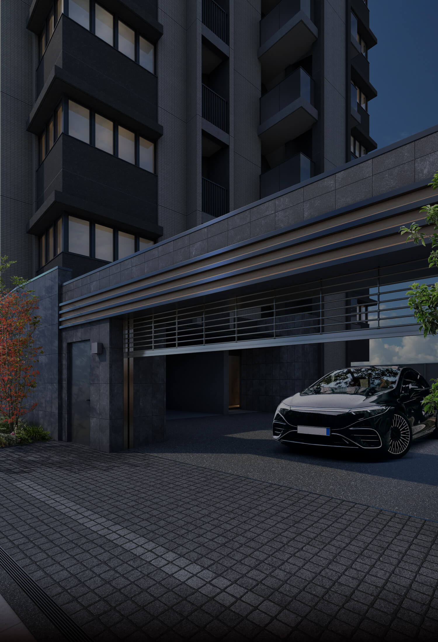 敷地内駐車場(リングシャッターゲート内)への出入り。また、駅からの導線を考慮したサブエントランスを設置。