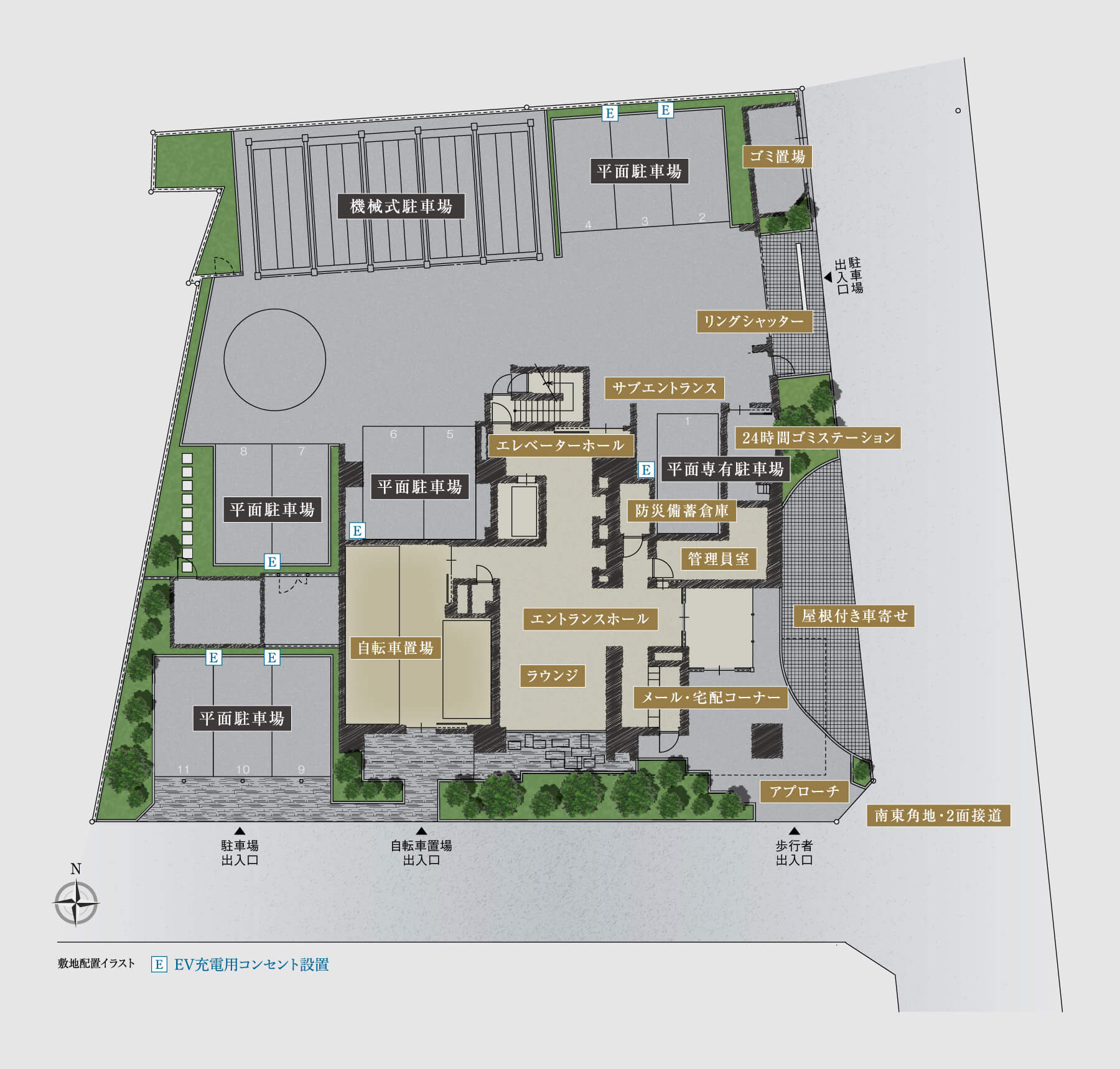 歩行者と車の出入口を分けた歩車分離設計を採用。住まわれる方の安全性に配慮し、事故の発生を抑止します。