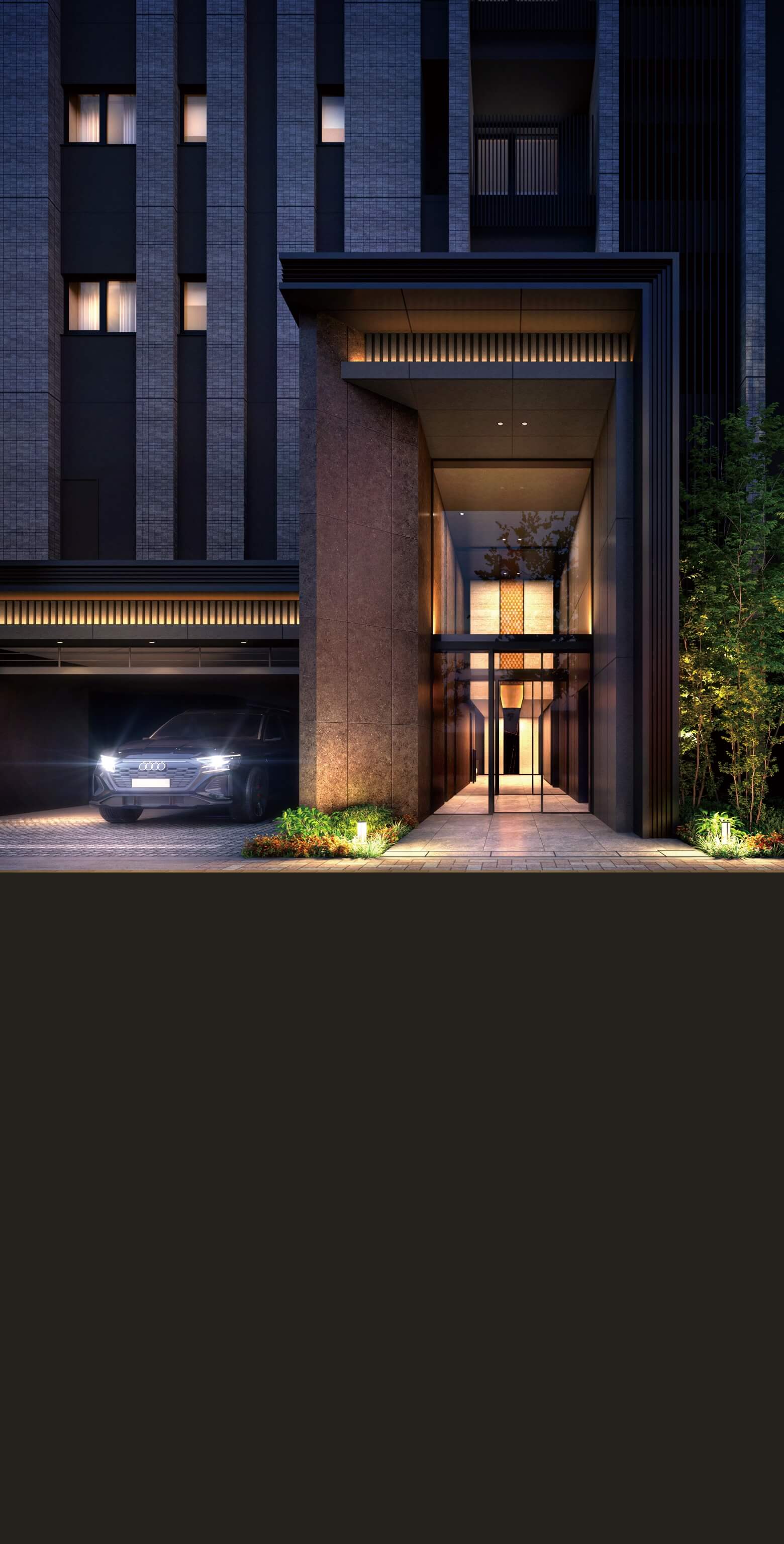 植栽は実際に植樹する樹型、枝ぶり、葉や色合いとは異なる場合があり、特定の季節の状況、入居時期を想定したものではありません。