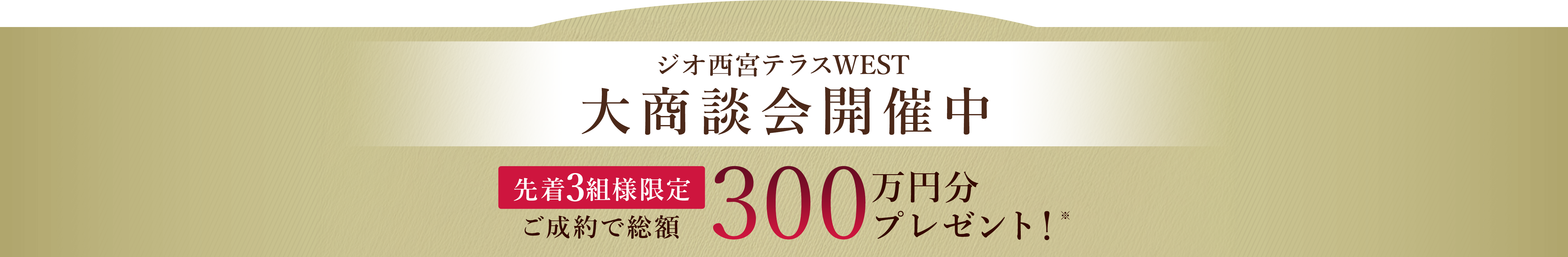 ※キャンペーン期間:2026年5月31日(日)まで。対象住戸 ジオ西宮テラスWEST104号室、301号室、501号室を先着順にてご成約いただいた方を対象に、契約時の諸費用計100万円分をそれぞれプレゼントいたします。なお、現状有姿でのお引渡しとなります。また、契約の対象となられた方は、権利を第三者に譲渡したり、他の目的に使用することはできません。その他サービス・キャンペーンとの併用はできません。詳しくは販売スタッフまでお問い合わせください。