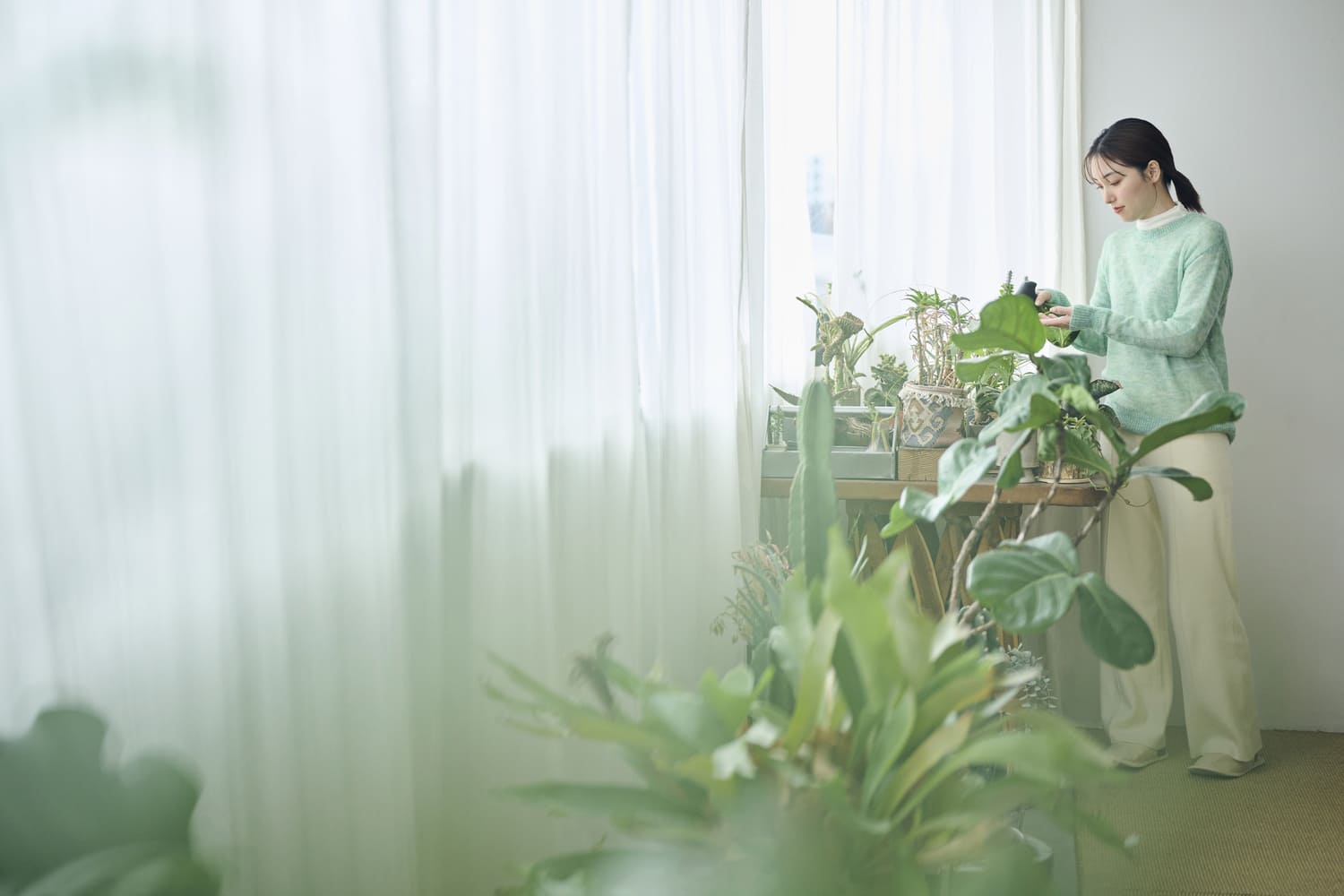 観葉植物の葉や茎には気孔と呼ばれる小さな穴があり、根から吸い上げた水分を水蒸気として放出する「蒸散」を行っています。この蒸散が天然の加湿器代わりになるため、冬場はこまめに観葉植物への水やりを行いましょう。また、霧吹きを使って 直接葉や茎へ水を吹きかける「葉水」を行えば蒸散を促す効果につながります。