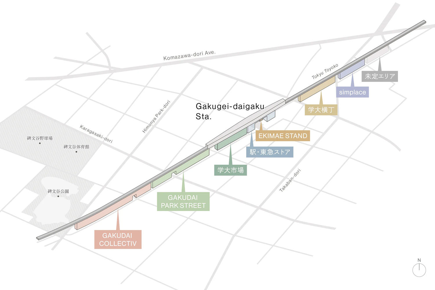 街の人々に長く親しまれる新しい「居場所」を高架下に。南北1.2kmの高架下を8つのエリアに分けて構成された「学大高架下」。