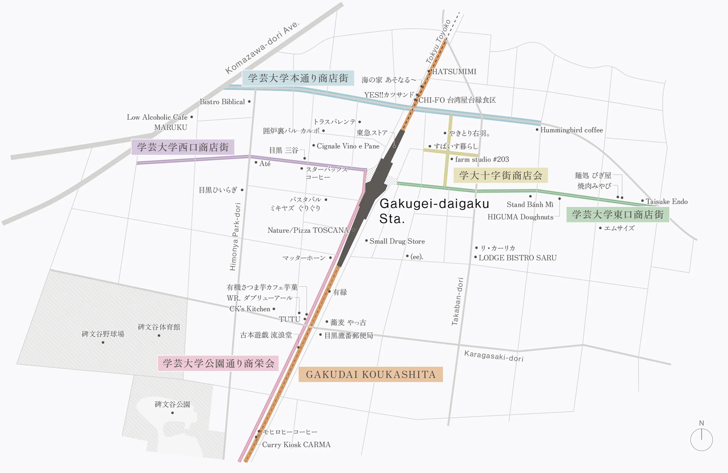 「学芸大学」駅周辺には、下町情緒とトレンドが重なり合った6つの商店街が集い、賑わいの風景を形づくっています。