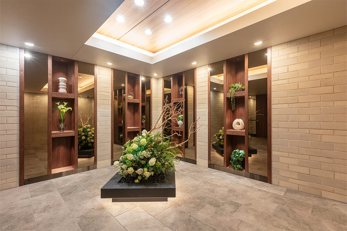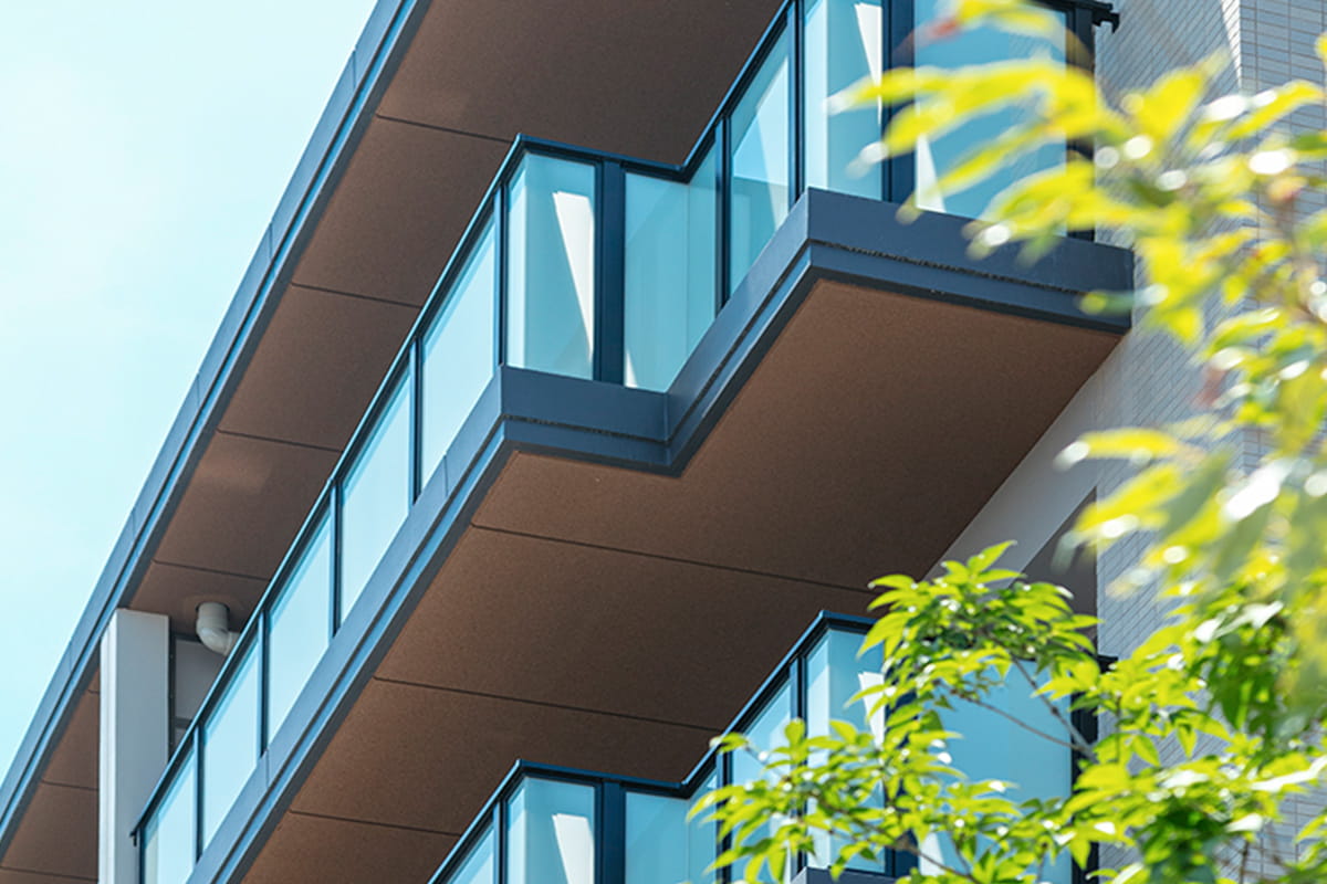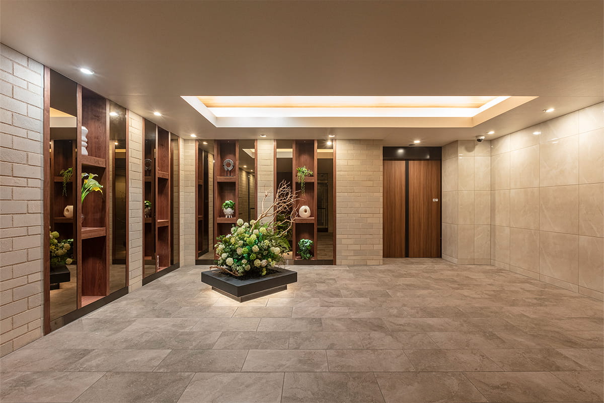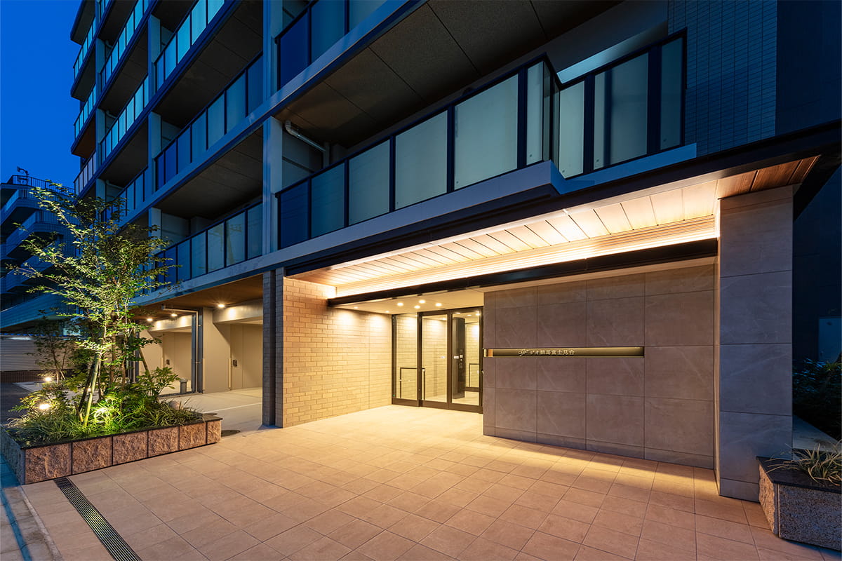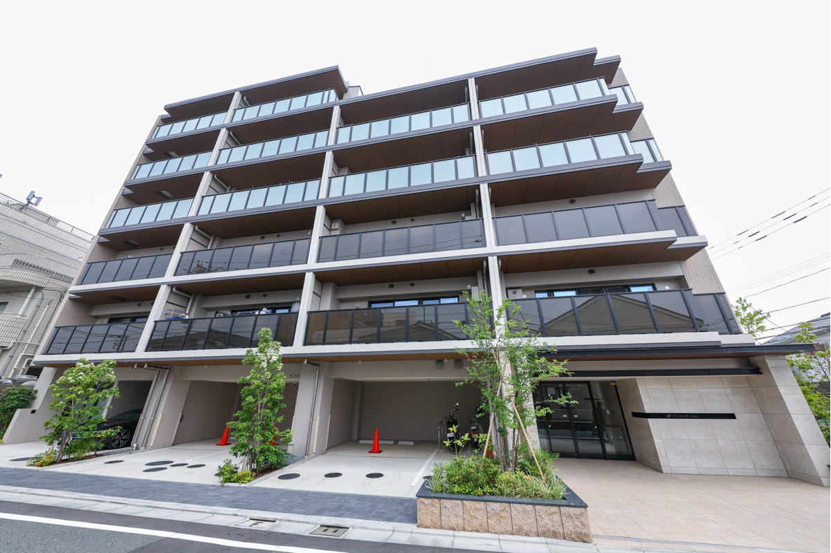 オフホワイトにアースカラーのタイルを組み合わせた外壁の色調や上層・低層で色分けされたガラス手摺が、シックで穏やかな大人の邸宅を印象付ける外観デザイン。地上6階・全36邸の凛とした佇まいに、敷地内の豊富な植栽が潤いを添える、モダンレジデンスです。