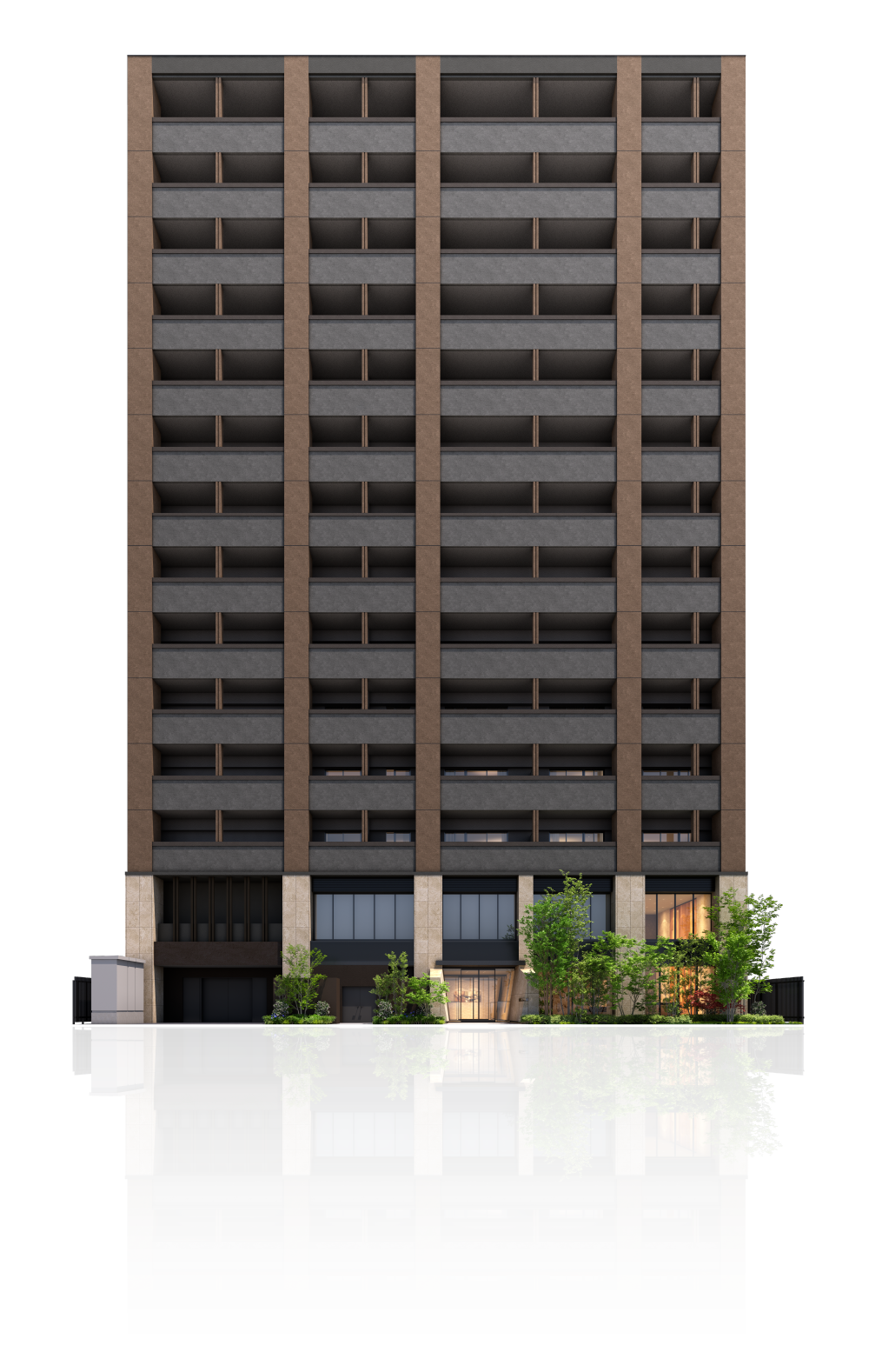 ファサードは、基壇部・中層階・最上階のボリュームを分節し、