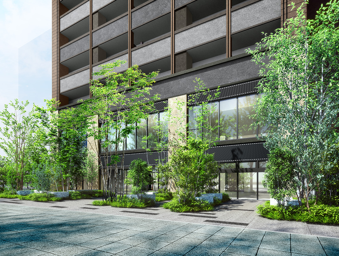 安らぎと美しい街並みを創出する公開空地。 豊かな緑を映し出す多種多彩な植栽や、石のベンチが設置されており、 ゆったりとしたひとときを過ごすことができます。