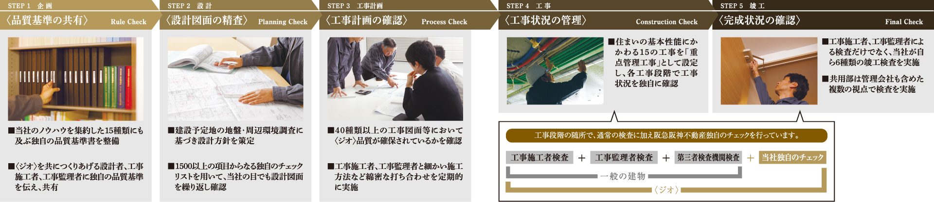 企画・設計・工事計画・工事・竣工に至る5つのステップにわたり、