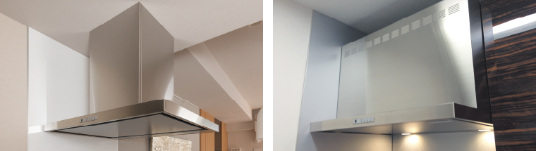 スタイリッシュなステンレス製レンジフードを採用しています。油煙の吸気効率を高める整流板付です。整流板は油汚れも簡単に拭き取れ、取り外して丸洗いもできます。 ※タイプによりレンジフード形状が異なります。