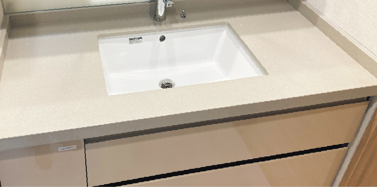 機能性とデザイン性を兼ね備えた手洗い器付きのカウンターをご用意しています。カウンター天板には、高級感のあるフィオレストーンを採用しています。 ※フィオレストーン天板には、維ぎ目が入る場合があります。また製造上、色柄のブレ・厚みのバラツキなどがあります。