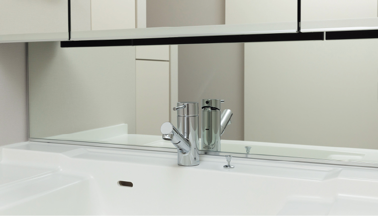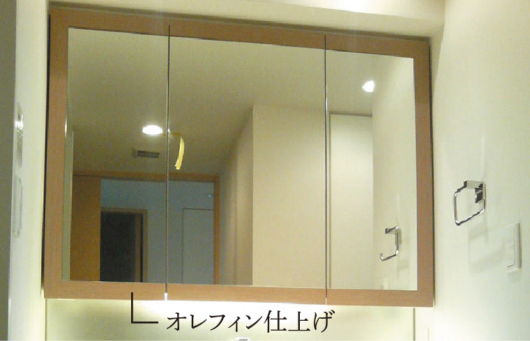 洗面化粧台の鏡は四方をオレフィン仕上げとし、上質な雰囲気を演出しています。
