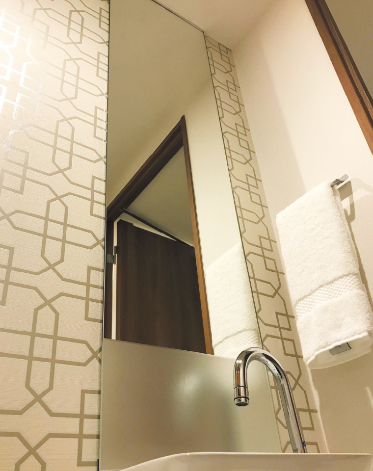 トイレの手洗いカウンター上部に鏡を設けています。また、水がかかりやすい鏡の下部20cmは汚れが目立たないように、フロスト加工を施しています。