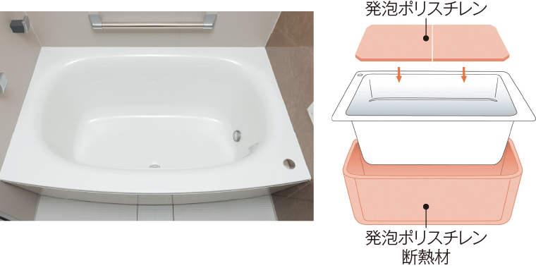浴槽を断熱材で覆うことと専用組みフタでお湯の温度を下がりにくくした、「保温浴槽」を採用しています。省エネ効果を期待できるほか、バスタイムが異なるご家族にもうれしい仕様です。 ※下記概念図はFRPストレート浴槽のものです。