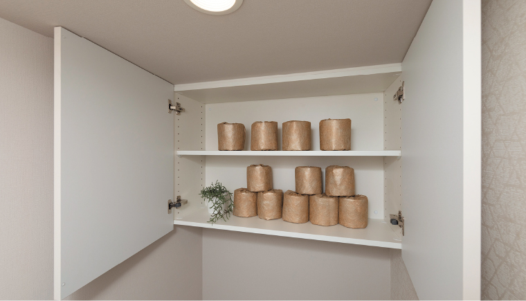 トイレットペーパーなどの収納に便利な吊戸棚。インテリア性に配慮した扉付で、空間を美しく保ちます。